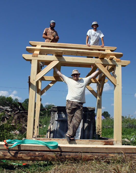 Мастер-класс по строительству каркаса мастерской Павла Притупа завершился 15 июля, когда разъехались последние участники: Иван и Мария из Москвы и Павел из Томска. За неделю до нашего финиша стало ясно, что возвести каркас до 15 июля не получится из-за нескольких причин: мои недочеты в организации рабочего процесса, небольшая скорость работы участников мастер-класса (но с отличным качеством!), невозможность совместить быструю работу и качественное обучение в придачу с общением среди всех участников и т.д. Отпускать своих гостей без монтажа мне не хотелось, поэтому в последние два дня мы решили переключиться с каркаса мастерской на монтаж каркаса беседки, который я сделал для строительной выставки в 2008 году и который пролежал у меня полтора года. Этот монтаж был еще интересен тем, что он помог понять некоторые процессы усушки, происходящие в каркасе из сырого материала.