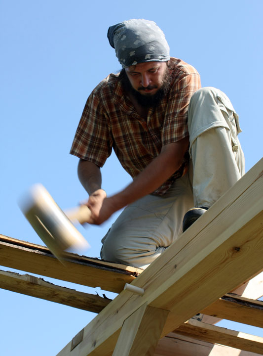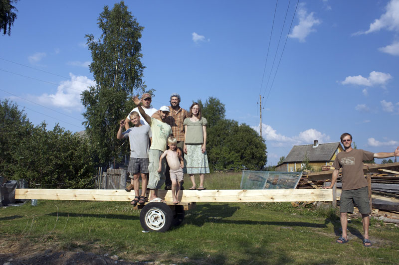 Мастер-класс по строительству каркаса мастерской Павла Притупа завершился 15 июля, когда разъехались последние участники: Иван и Мария из Москвы и Павел из Томска. За неделю до нашего финиша стало ясно, что возвести каркас до 15 июля не получится из-за нескольких причин: мои недочеты в организации рабочего процесса, небольшая скорость работы участников мастер-класса (но с отличным качеством!), невозможность совместить быструю работу и качественное обучение в придачу с общением среди всех участников и т.д. Отпускать своих гостей без монтажа мне не хотелось, поэтому в последние два дня мы решили переключиться с каркаса мастерской на монтаж каркаса беседки, который я сделал для строительной выставки в 2008 году и который пролежал у меня полтора года. Этот монтаж был еще интересен тем, что он помог понять некоторые процессы усушки, происходящие в каркасе из сырого материала.
