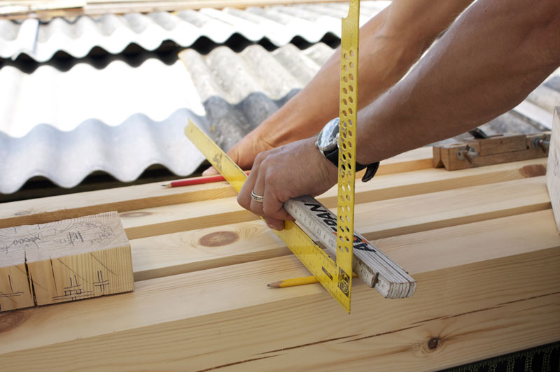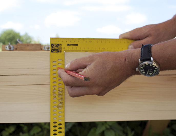 Разметка бруса немецким плотницким угольником.