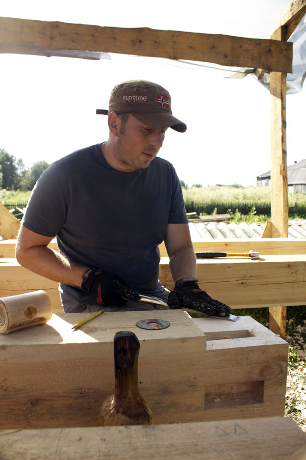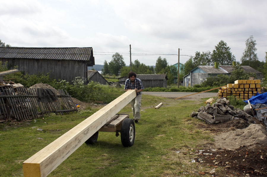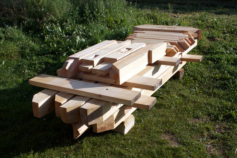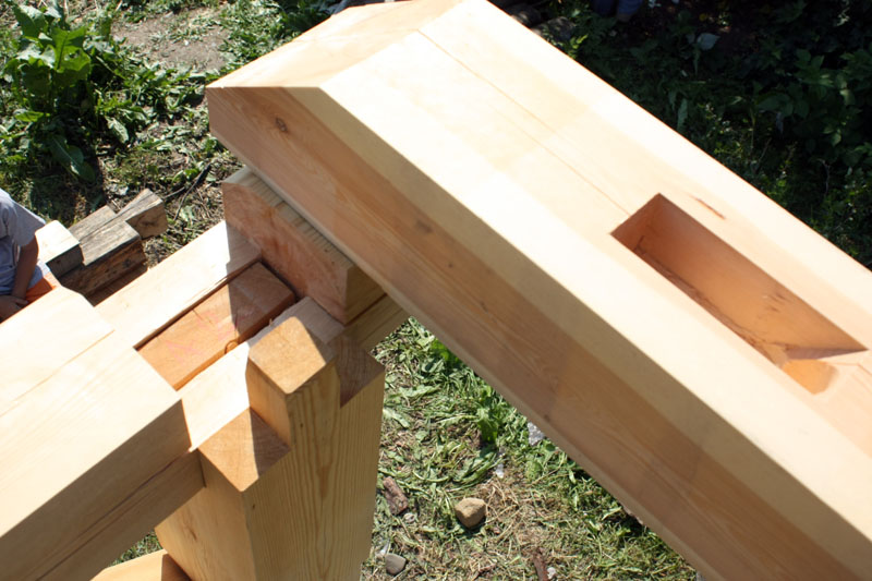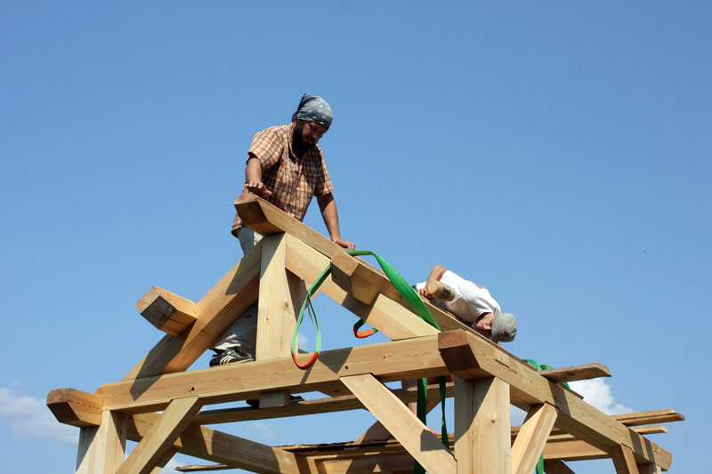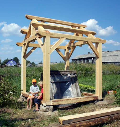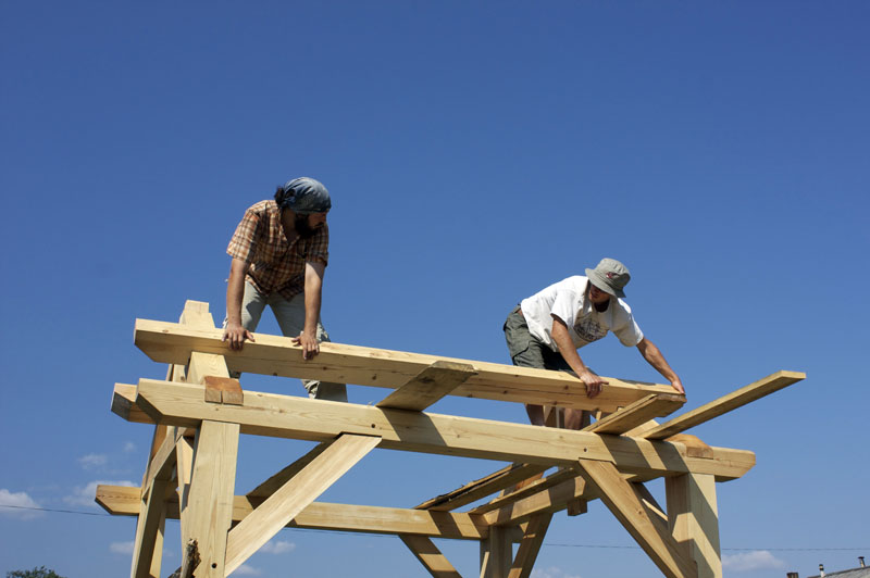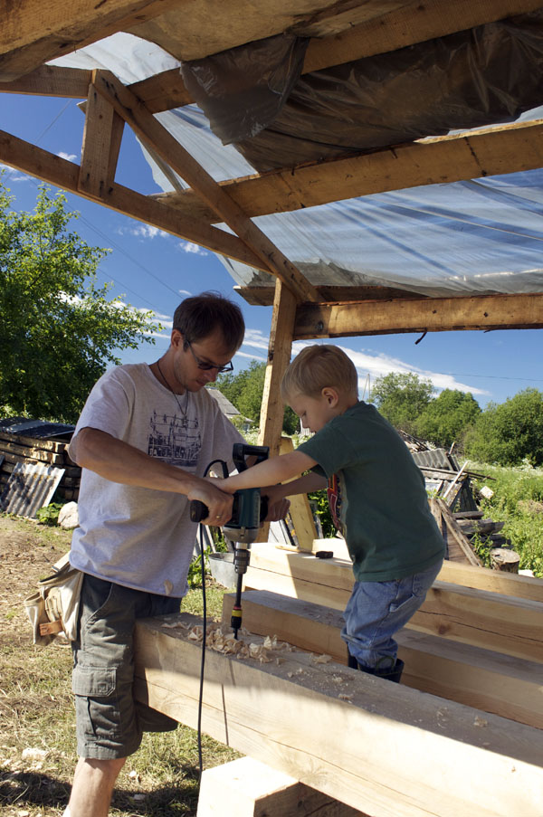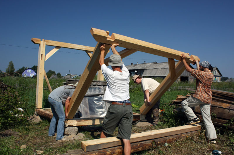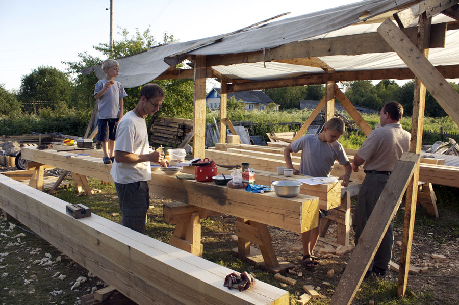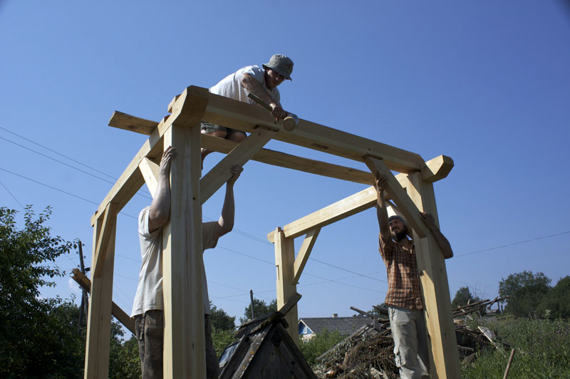 Мастер-класс по строительству каркаса мастерской Павла Притупа завершился 15 июля, когда разъехались последние участники: Иван и Мария из Москвы и Павел из Томска. За неделю до нашего финиша стало ясно, что возвести каркас до 15 июля не получится из-за нескольких причин: мои недочеты в организации рабочего процесса, небольшая скорость работы участников мастер-класса (но с отличным качеством!), невозможность совместить быструю работу и качественное обучение в придачу с общением среди всех участников и т.д. Отпускать своих гостей без монтажа мне не хотелось, поэтому в последние два дня мы решили переключиться с каркаса мастерской на монтаж каркаса беседки, который я сделал для строительной выставки в 2008 году и который пролежал у меня полтора года. Этот монтаж был еще интересен тем, что он помог понять некоторые процессы усушки, происходящие в каркасе из сырого материала.