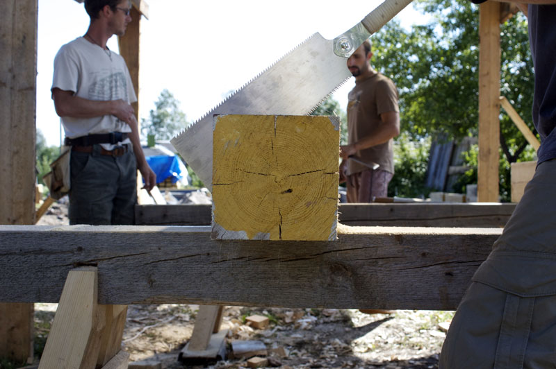 Это были фотографии, сделанные в самом конце мастер-класса. А 9-11 июля приезжали мои коллеги пообщаться друг с другом: пильщик Михаил Фаст из "Тимбер-тим" (Карелия), плотник Денис Меняйлов из Авторской группы "Фахверк" (Питер), кузнец ручного инструмента Михаил Артемьев (Петрозаводск), плюс те, кто приехал раньше: строитель деревянных сооружений Андрей Паталах (Ростов), будущие жители деревни Иван и Мария Петропольские (Москва), строитель собственного дома Павел (Томск), фермер и строитель из самана Глеб (Полтава).